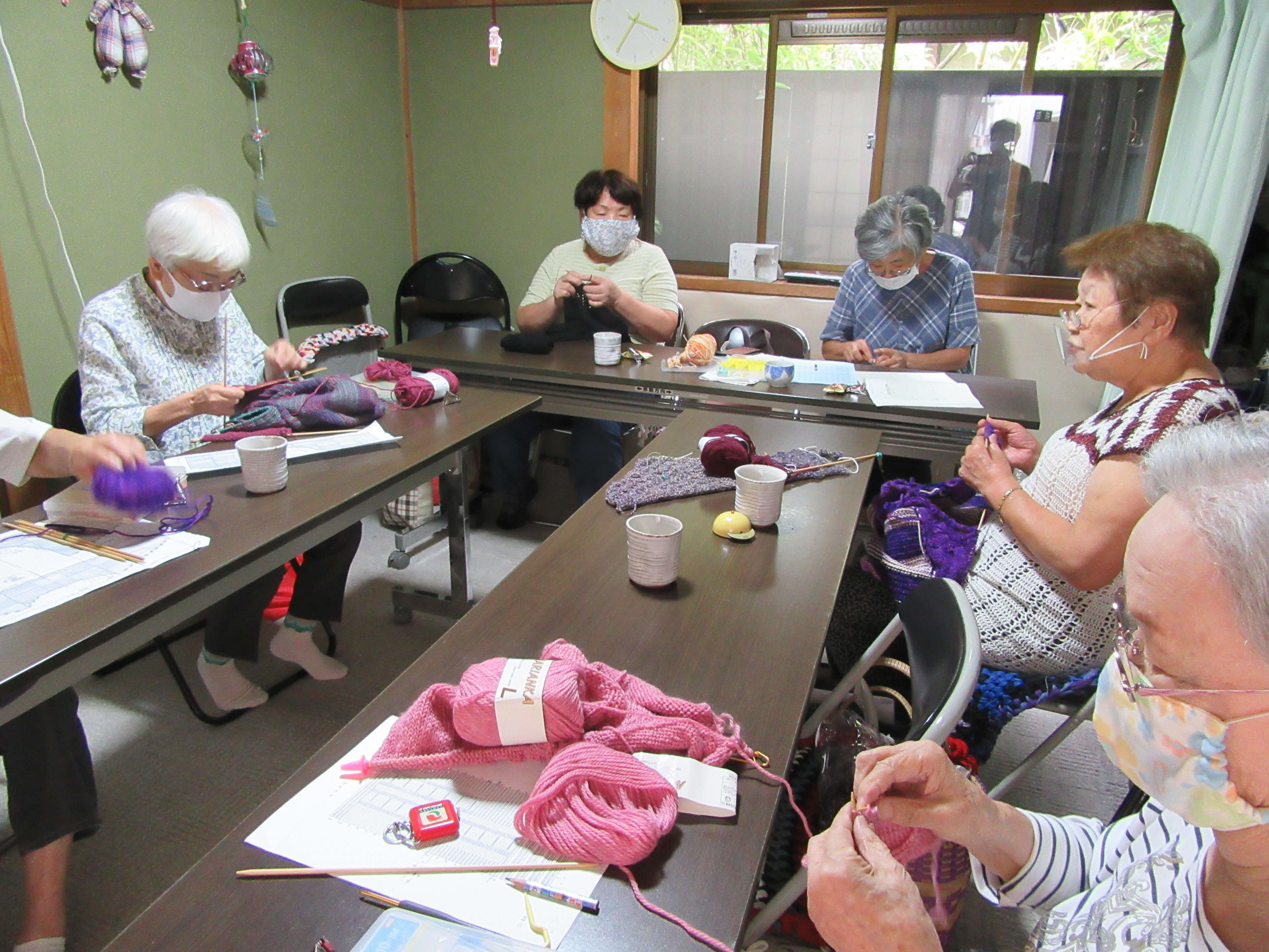 和やかで家庭的な雰囲気。指編みや裁縫、編み物が活発でバッグ、服、セーターなど日常で使える物を作っています。手仕事だけでなく、ヨガや体操にも取り組み、介護予防を行っています。 送迎:あり(西陵中学校区および隣接する中学校区程度) ※送迎サービスは、事業対象者、要支援1・2の人が対象です。 |