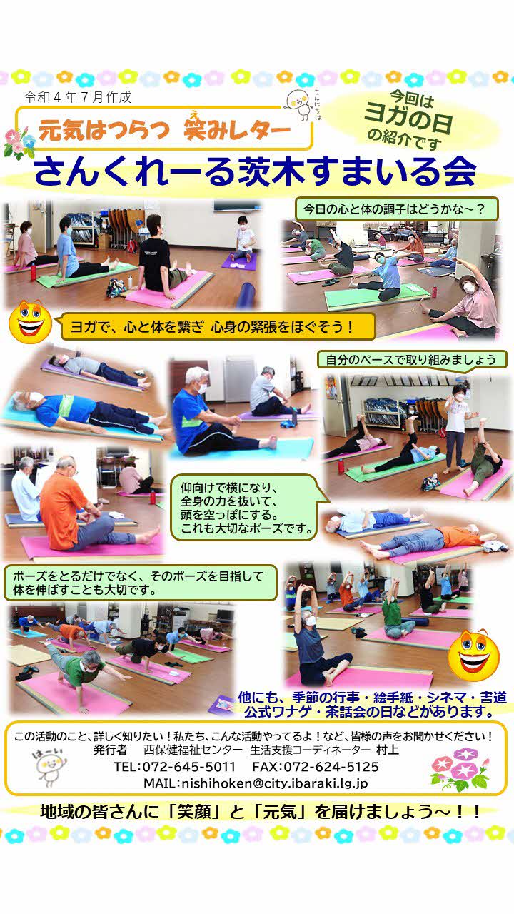 第2月曜 10:00~ 絵手紙 第3月曜 13:30~ すまいるシネマ 第2水曜 10:00~ 書道 第3水曜 13:30~ 運動体操 第4水曜 13:30~ 映像・叙情詩等 毎月1回 10:00~ ヨガ (20以降~月末に開催) 他の月・水 茶話会 その他、グラウンドゴルフ・季節の行事あり |