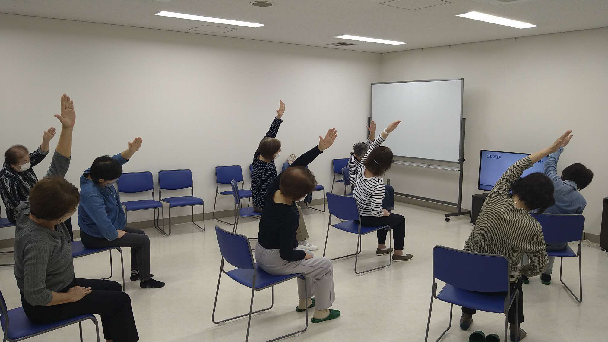 椅子に座っても参加できる体操を中心に準備体操から、身体全体を使う体操、音楽に合わせてのリズム運動になり ます。どれも簡単に無理なく参加することができる内容になっています。 |