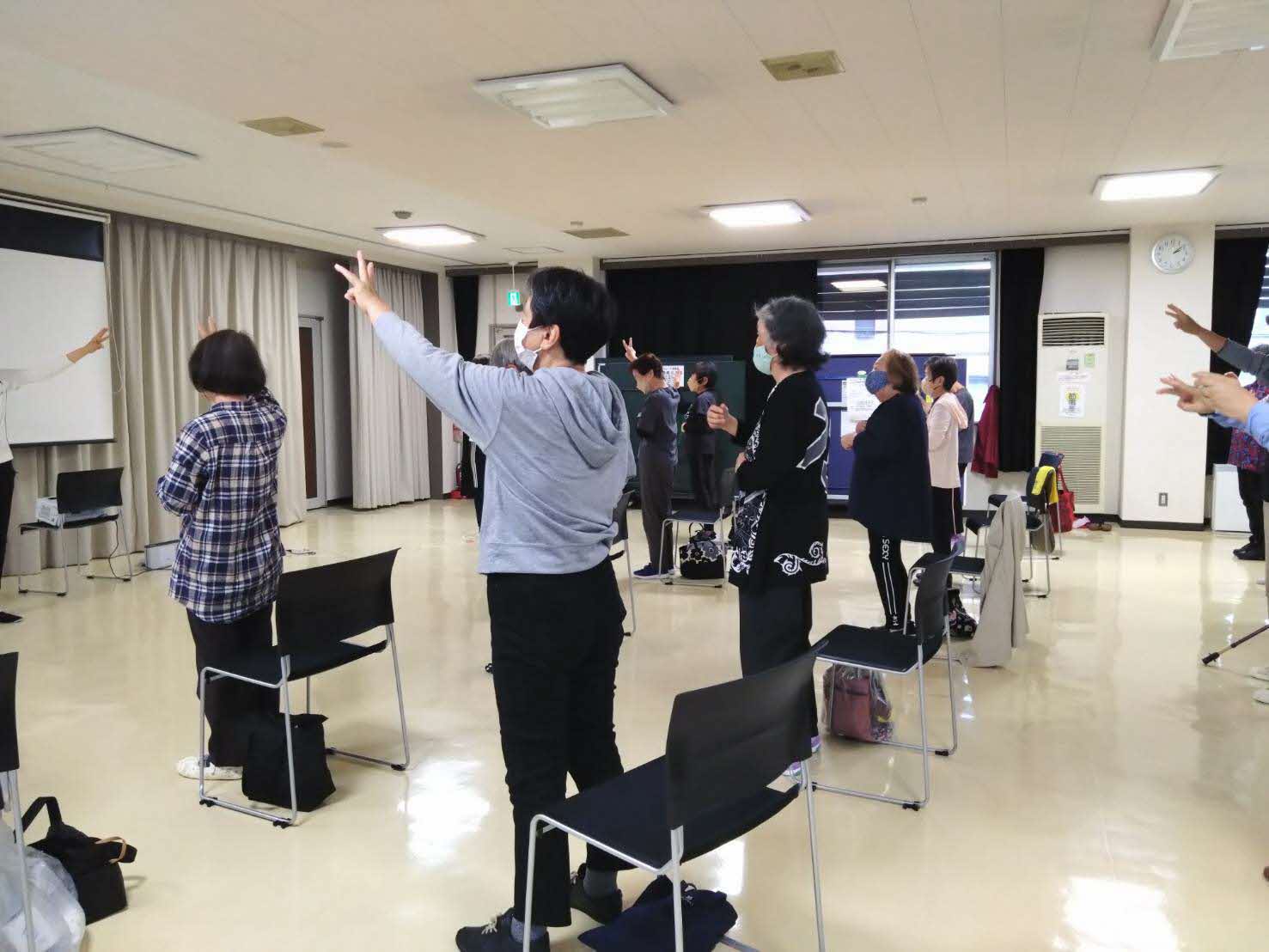 | 詳細内容 | 体操はストレッチ、筋力アップ、口腔、認知症予防(脳トレ)の4つで構成されており、参加者は動作確認が間違っていても気にせず、和気あいあいに楽しく心身をリフレッシュしています。 |