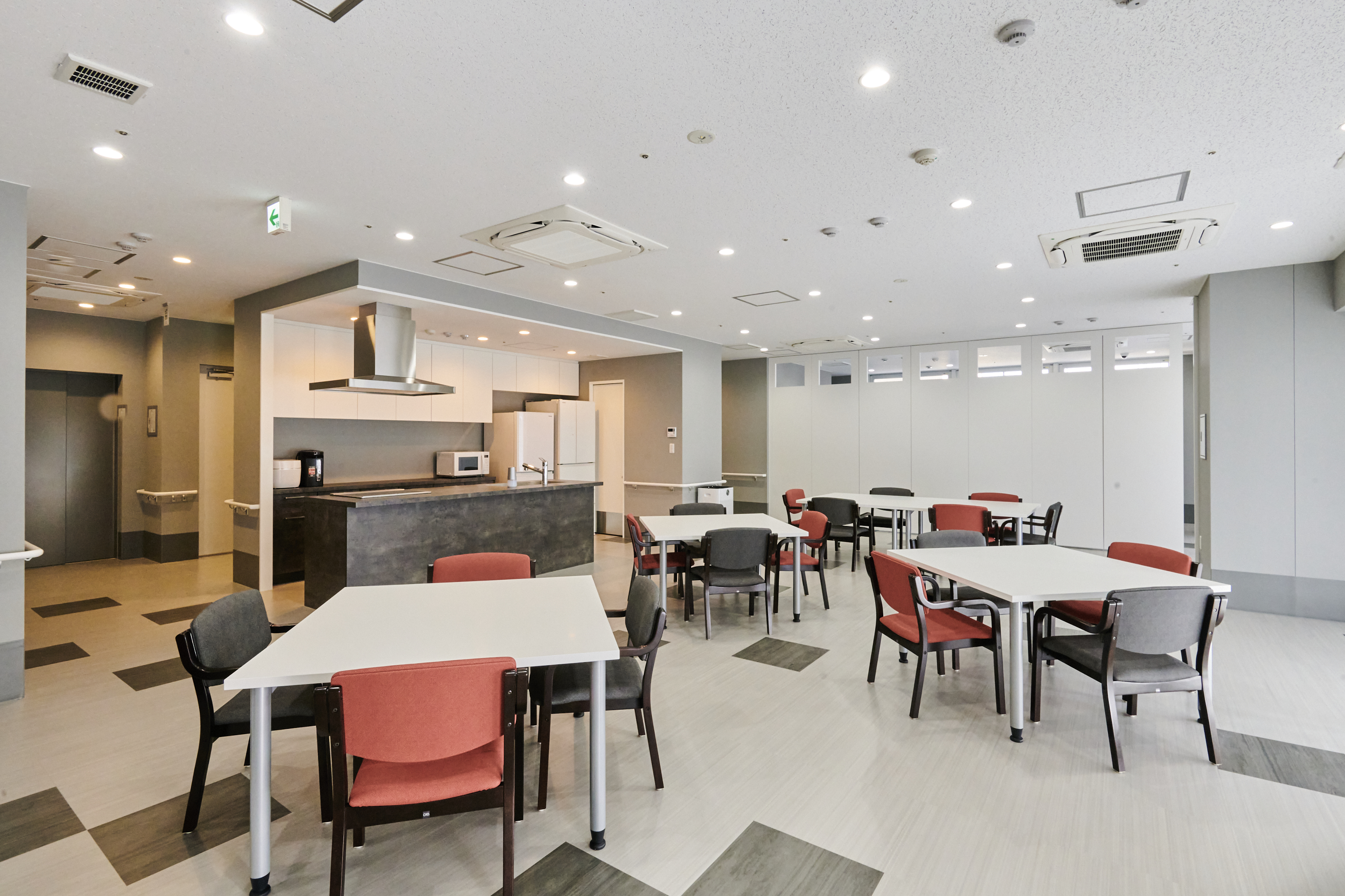 ご利用者様お一人お一人のニーズに沿って、サービスを提供していきます。 通いフロアと宿泊フロアが別の階に設置してあります。 通いフロアはシンプルでスタイリッシュなつくりになっていますので、介護サービスになれていない方でもご利用を始めやすい環境になっています。 |
