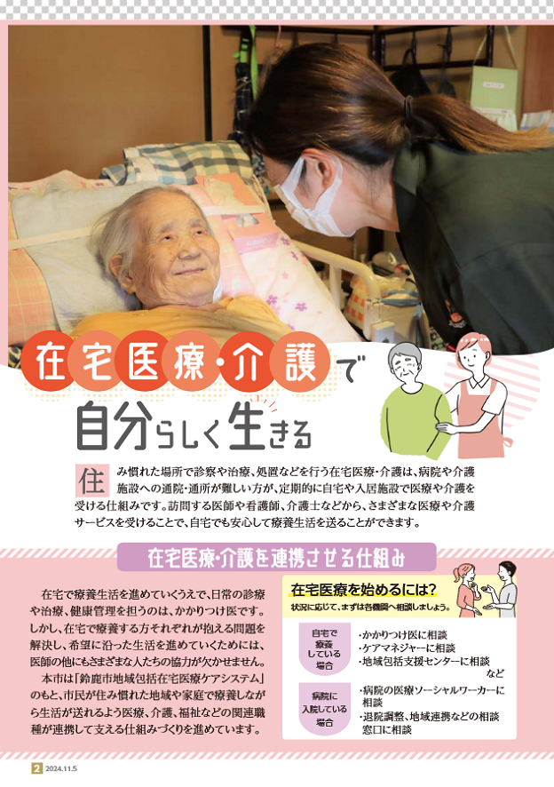 すみ慣れた場所で診察や治療、処置などを行う在宅医療・介護は、病院や 介護 施設への通院・通所が難しい方が、定期的に自宅や入居施設で医療 や介護を 受ける仕組みです。訪問する医師や看護師、介護士などから、 さまざまな医療や介護 サービスを受けることで、自宅でも安心して療養 生活を送ることができます。