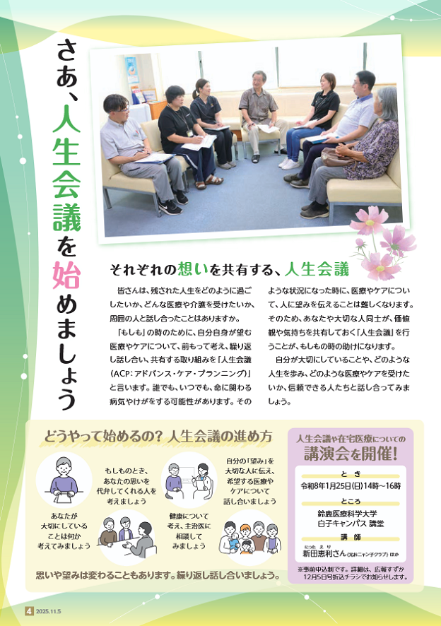 皆さんは、残された人生をどのように過ごしたいか、どんな 医療や介護を受けたいか、周囲の人と話し合ったことはありますか。 「もしも」の時のために、自分自身が望む 医療やケアについて、 前もって考え、繰り返 し話し合い、共有する取り組みを 「人生会議 (ACP:アドバンス・ケア・プランニング)」 と言います。